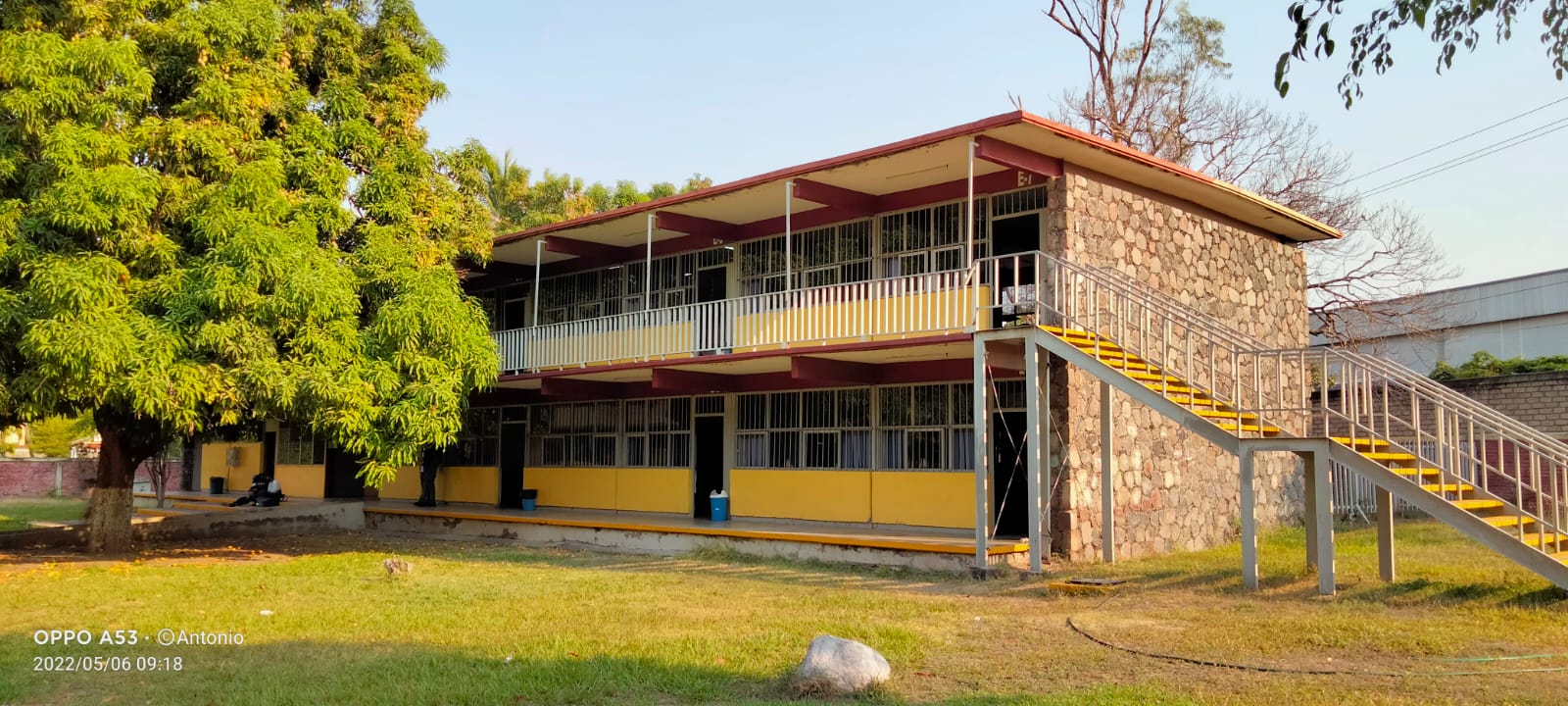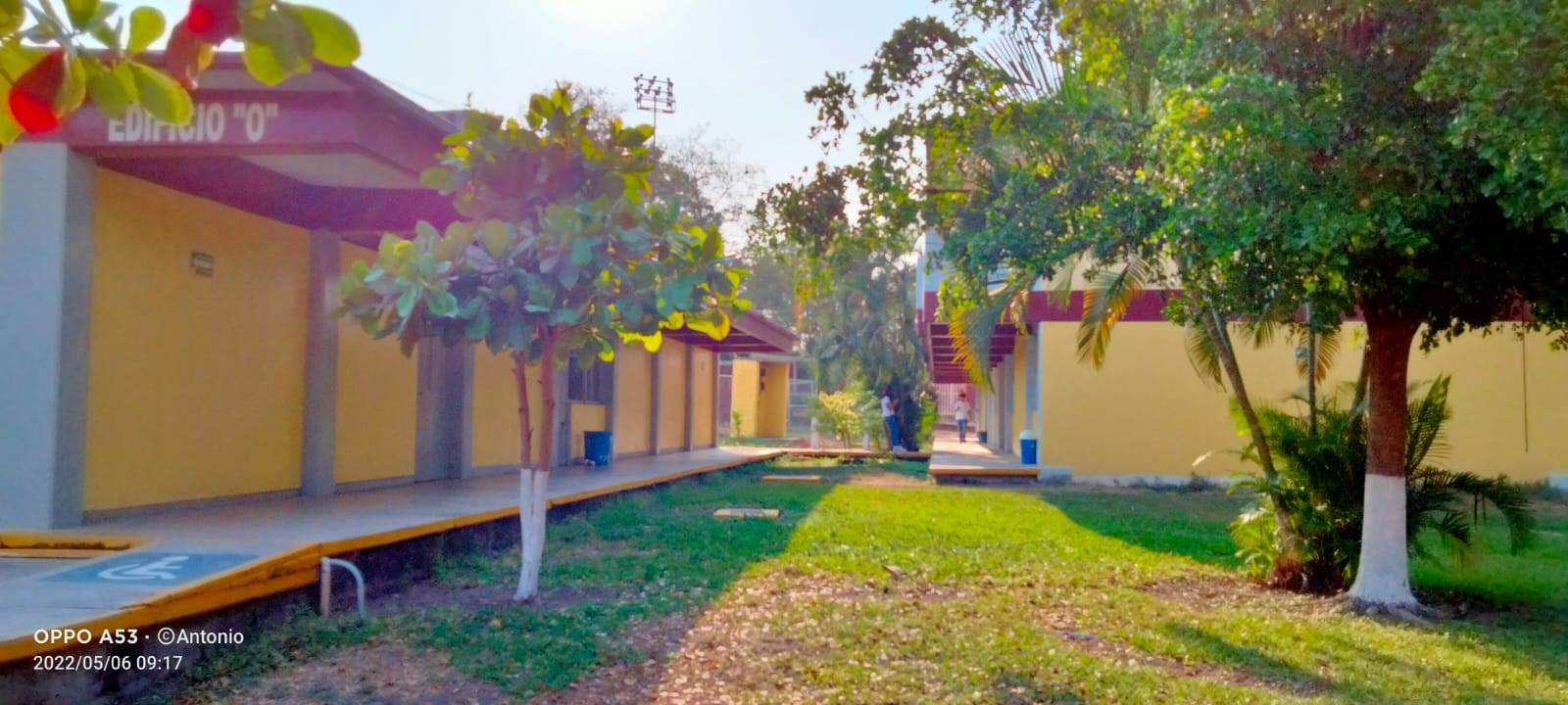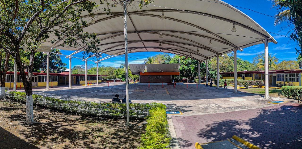 En el centro se encuentra la cancha principal donde tambien se hacen ceremonias y eventos. Por el pasillo uno llega a las canchas de Futbol, Basquetbol y Voleybol donde al otro lado es visible el estacionamiento de los docentes.